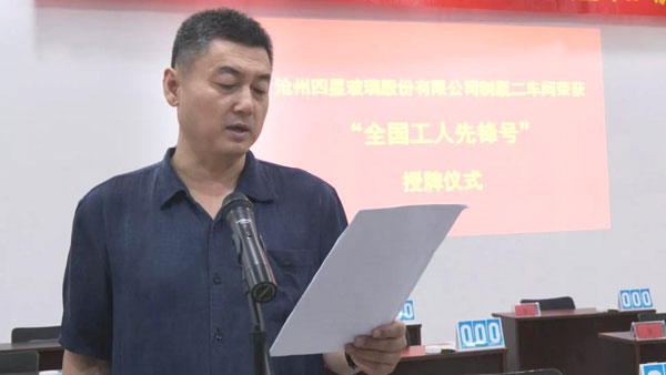 6月29日上午,滄縣總工會在滄州四星玻璃股份有限公司舉行“全國工人先鋒號”授牌儀式,為榮獲“全國工人先鋒號”的滄州四星玻璃股份有限公司制瓶二車間頒發(fā)表彰授牌,滄縣人大常委會副主任、總工會主席徐澤林,滄縣總工會黨組書記、常務(wù)副主席趙洪濤,中共滄縣縣委組織部副部長、兩新工委書記李金峰,滄州市總工會組織部副部長王超,紙房頭鎮(zhèn)黨委書記許勇,紙房頭鎮(zhèn)人大主席何玉利,紙房頭鎮(zhèn)人大副主席呂增煥,滄州四星玻璃股份有限公司董事長王煥一參加了授牌儀式。